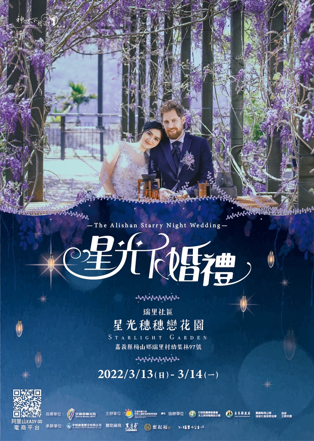 另外阿里山管理處最浪漫的企劃「阿里山神木下婚禮貳部曲-星光下婚禮」,即將開始報名囉!報名期間自111年1月21日(星期五)凌晨0時至111年2月14日(星期一)夜間24時為止;星光下婚禮以結合『紫藤花下的浪漫』,串連在地文化、特色店家、手作DIY體驗、紫色愛戀饗宴,打造獨一無二紫色山城浪漫氛圍,在絕美地景伴隨著繁星點點的夜空,新人們於紫藤花下互許終生,如同緊緊交纏的紫色花葉永結同心,綻放最美的愛情,今年度將錄取海內外新人共計15對,一律採網路報名,報名詳情請至「阿里山EASY GO」電商平臺或伊貝特報名網報名連結。