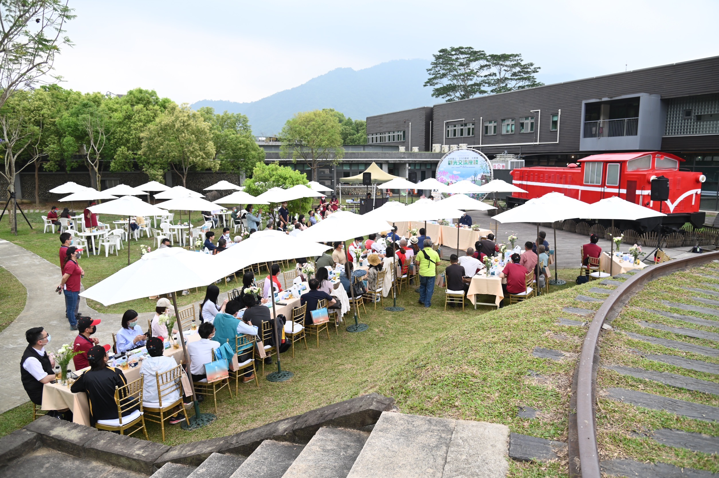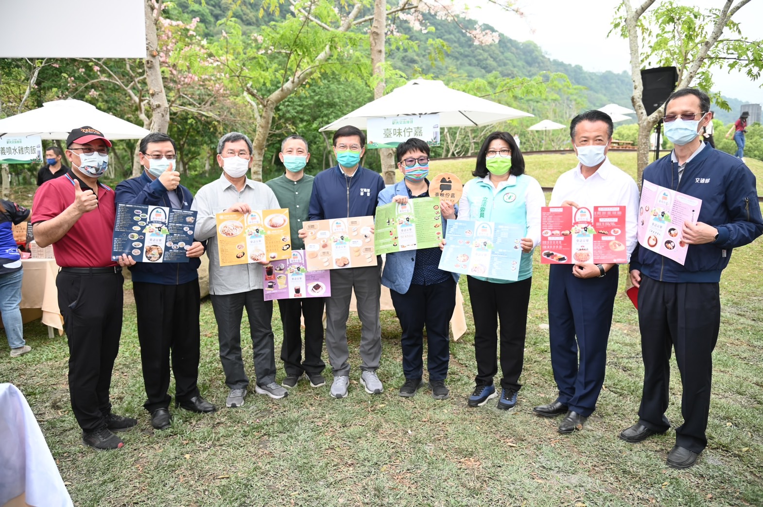 | 4交通部部長王國材、立法委員陳明文、立法委員王美惠、嘉義縣縣長翁章梁、交通部觀光局局長張錫聰、阿里山管理處洪維新與在地產業夥伴太平社區小小泡茶師合照 |