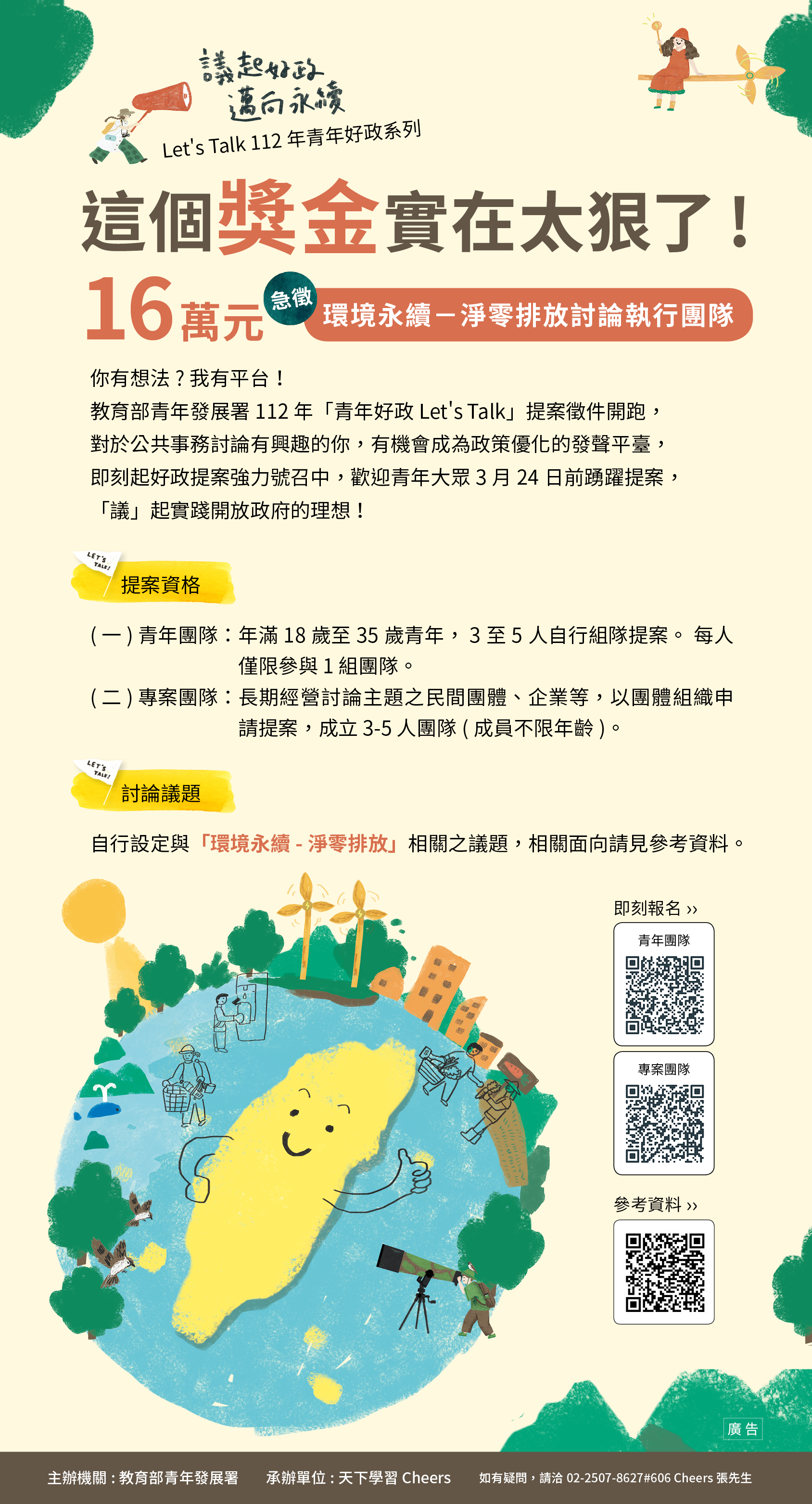 二、本年Let's Talk計畫討論主題為「環境永續-淨零排放」,請協助公告宣傳,並轉知青年或相關團隊踴躍提案。提案簡章簡要說明如下: