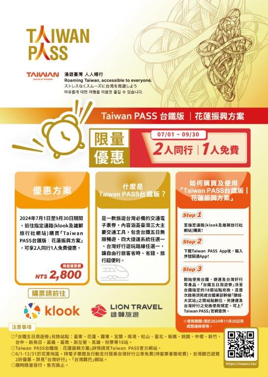 交通部觀光署獎助旅客使用Taiwan PASS台鐵版旅遊宜花東地區優惠實施要點