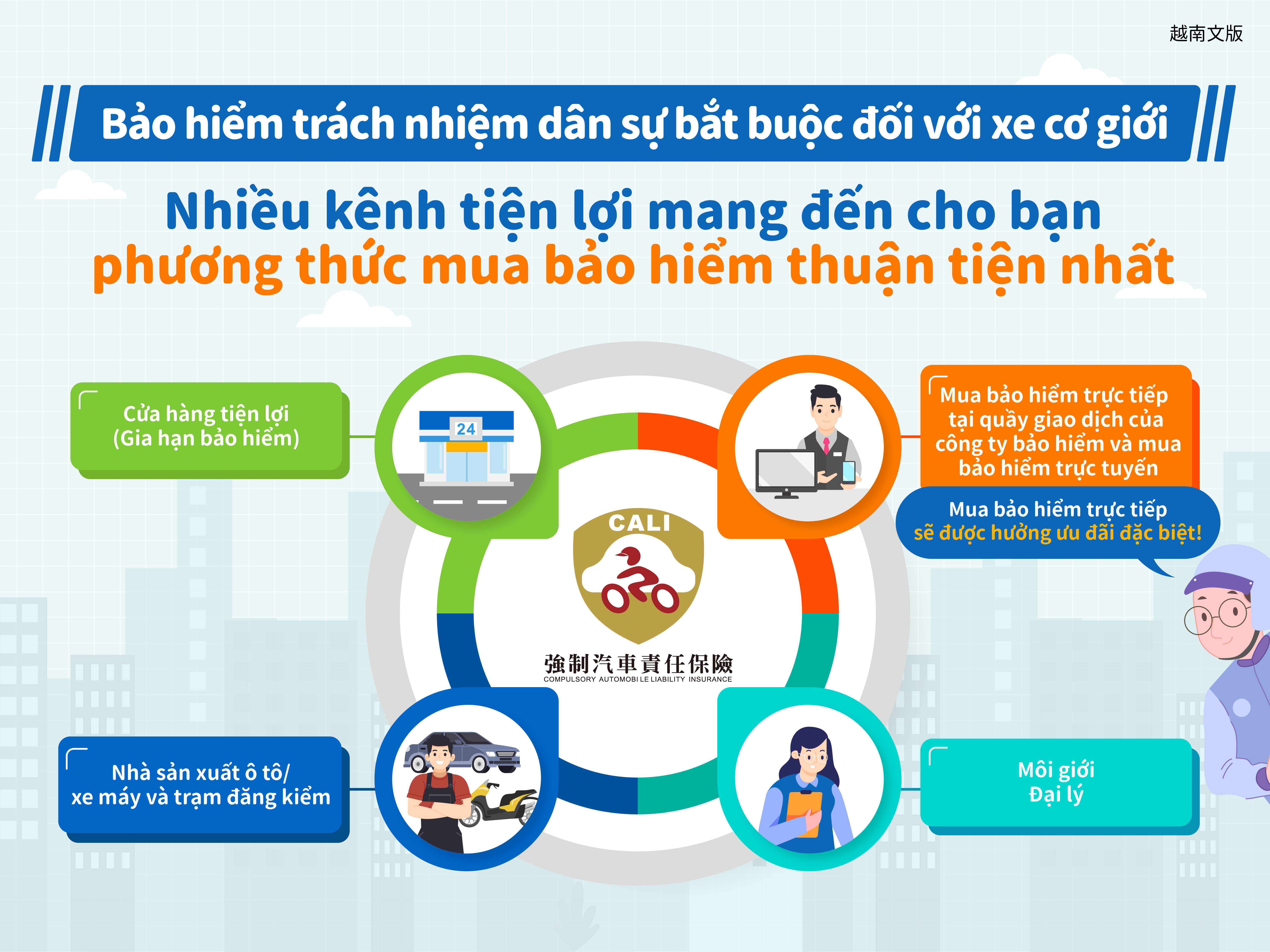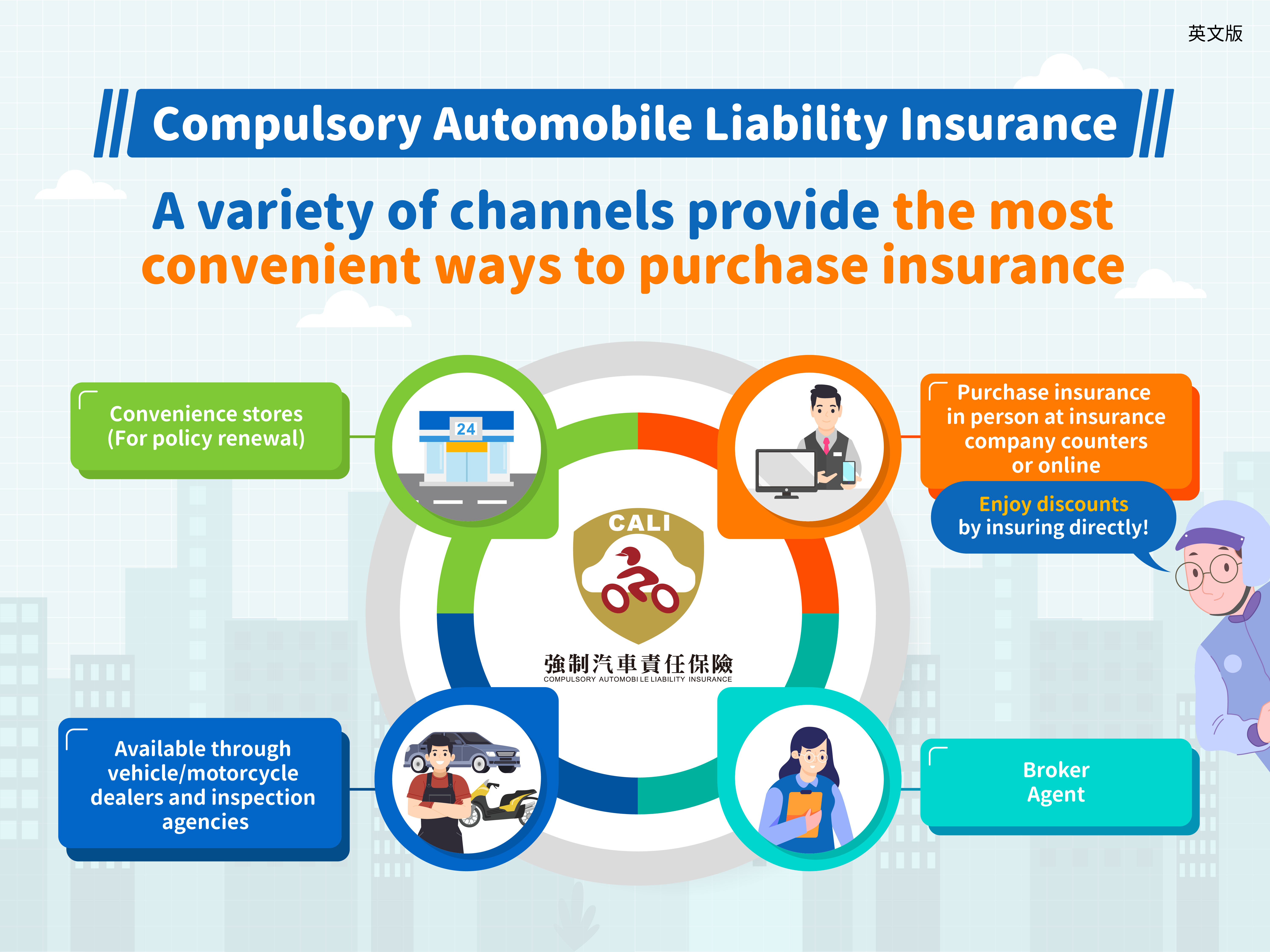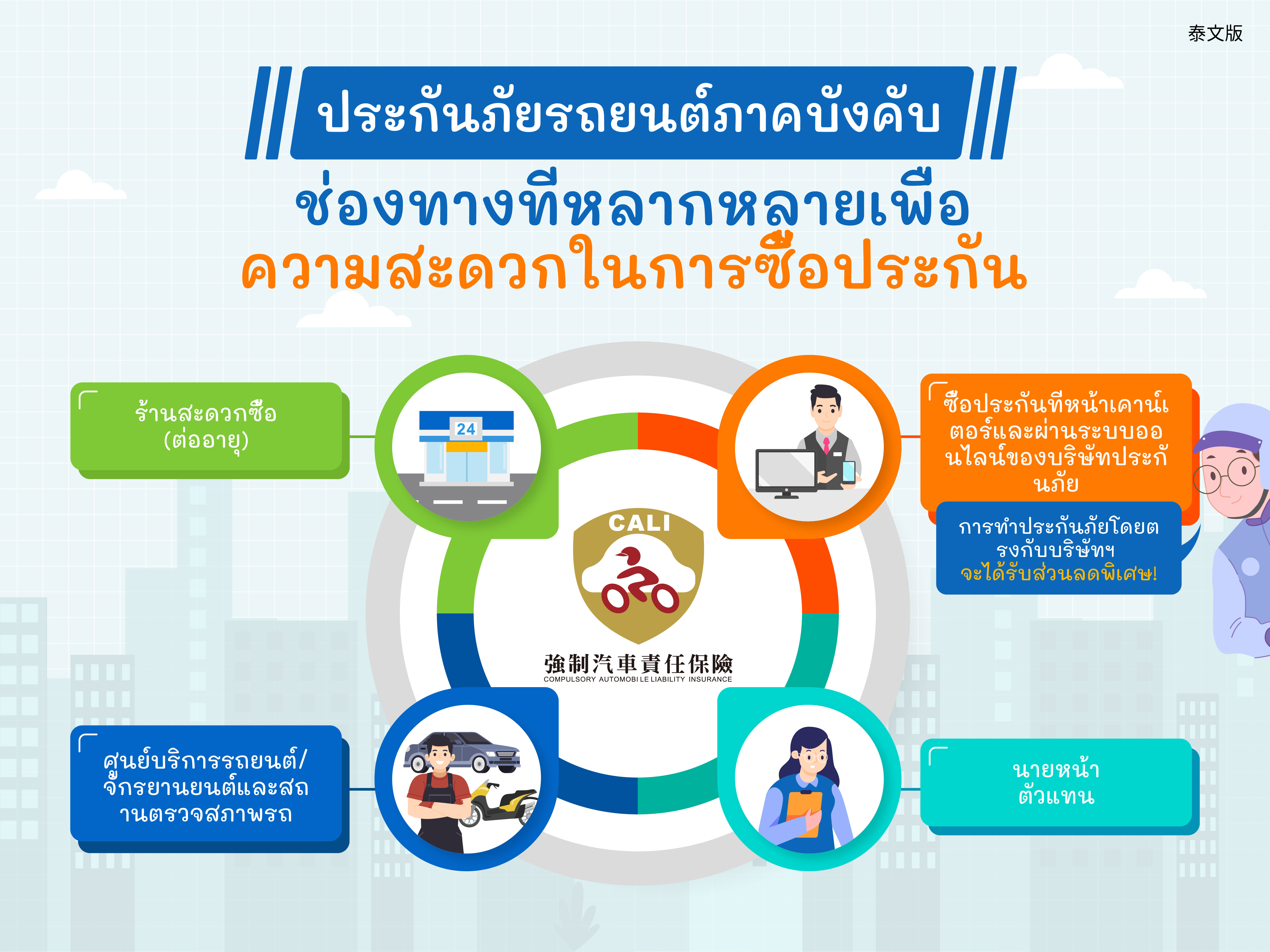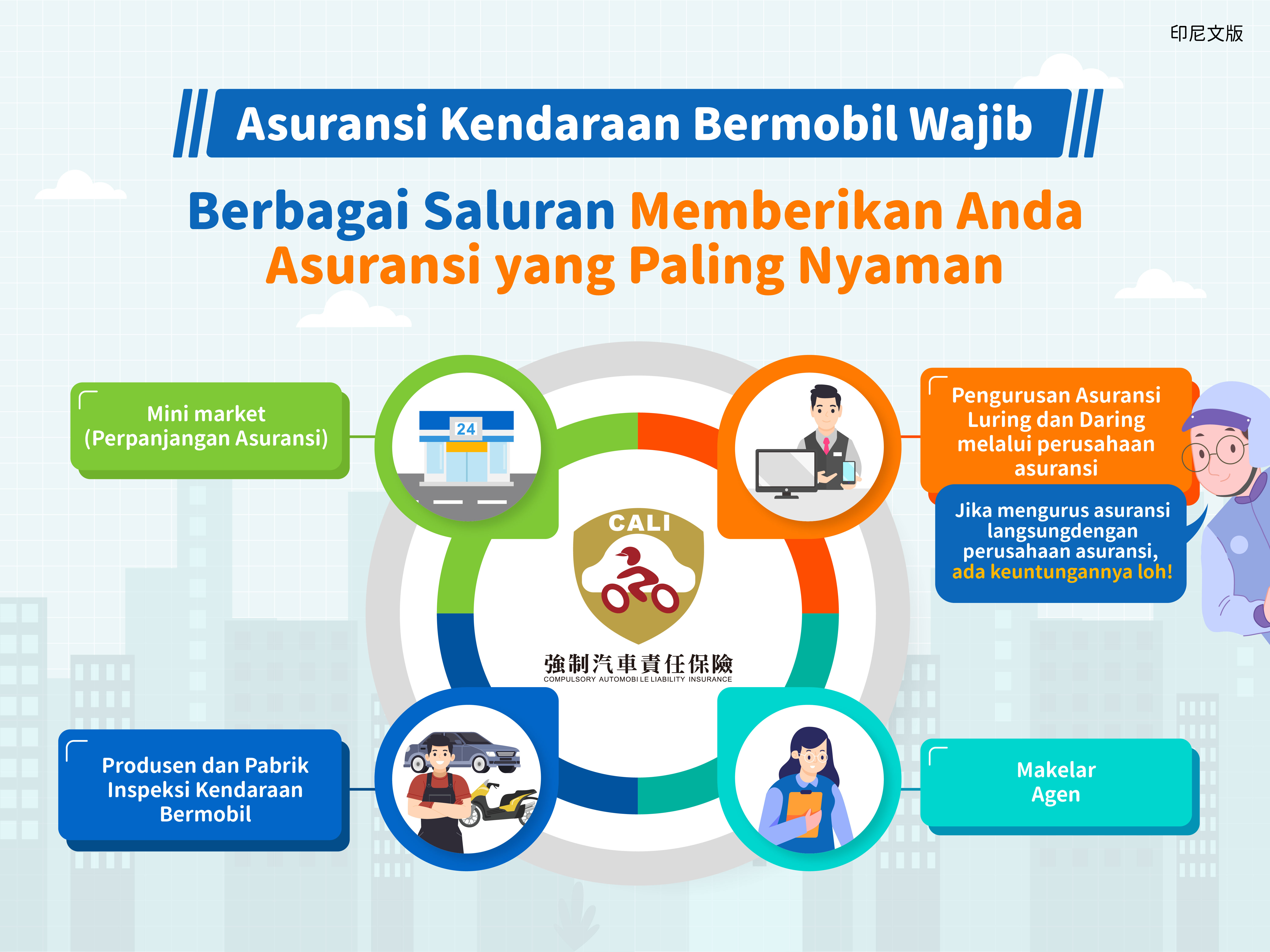 為落實政府政策與法制之推行,以保障車禍受害人基本權益與維護道路交通安全,因應新住民及外籍勞工來台人數漸增,且其使用之交通工具微型電動二輪車已納入強制汽車責任保險法,故製作相關宣導文宣「強制車險投保管道」(中文、英文、印尼文、泰文及越南文)及「強制車險申請理賠流程/相關機關(構)服務電話及網址」(中文、英文、印尼文、泰文、越南文及馬來文)。