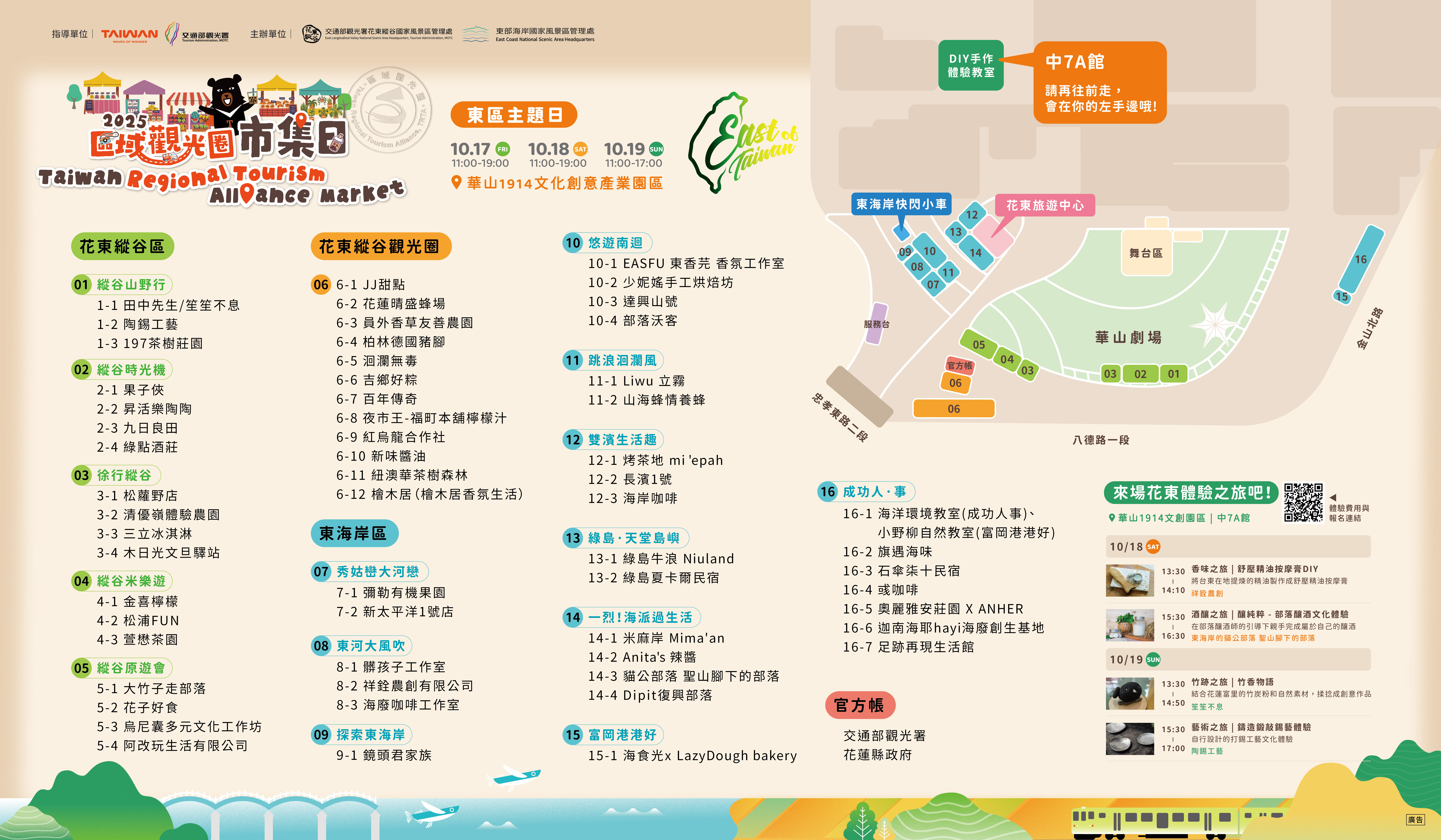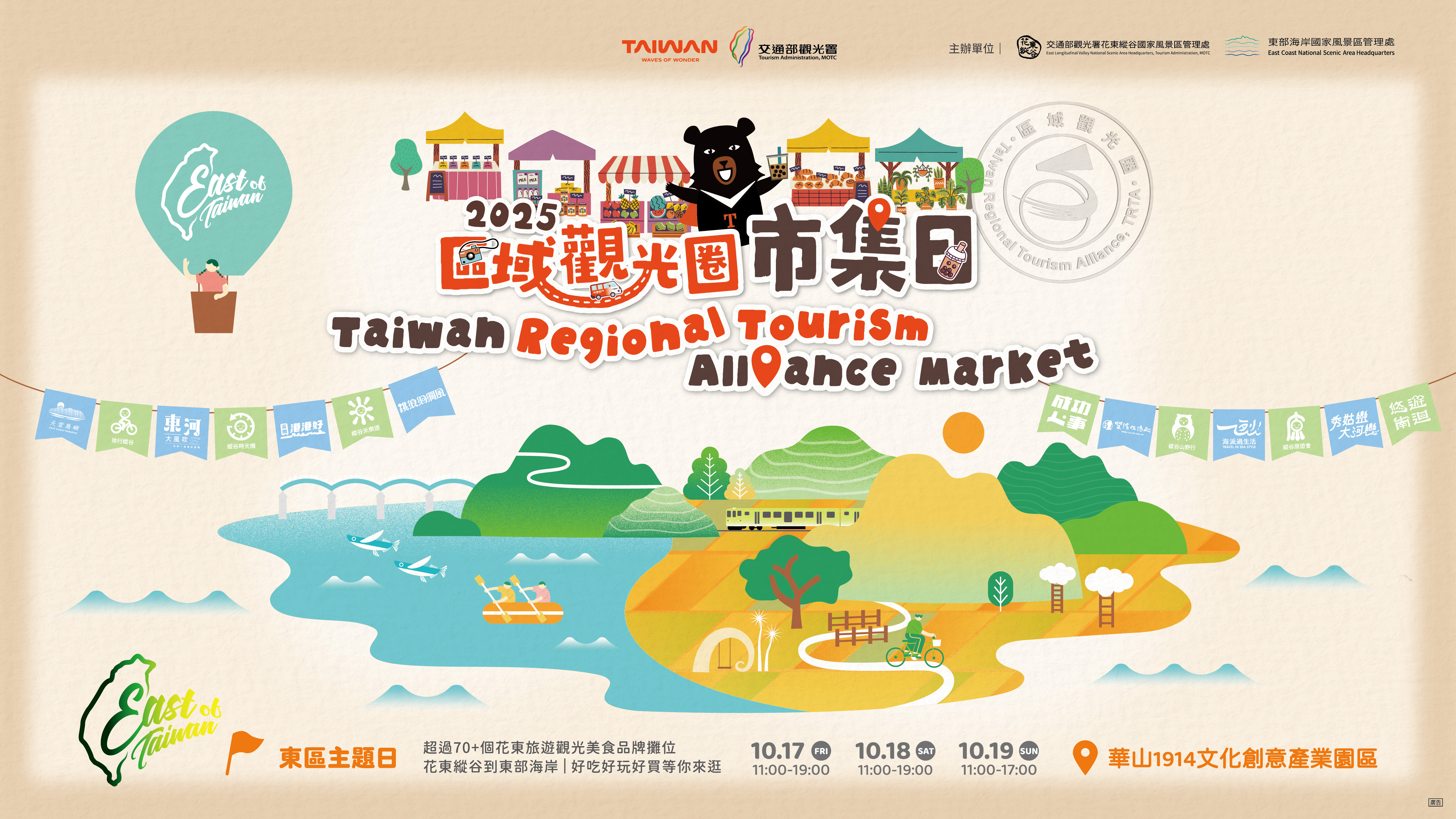 由交通部觀光署花東縱谷國家風景區管理處及東部海岸國家風景區管理處共同主辦之「2025區域觀光圈市集日-東區主題日」,將於10月17日至19日於臺北華山1914文化創意產業園區熱鬧登場!這次花東攜手北上,帶來滿滿花東風情的音樂舞台、手作體驗、市集美食與限量好禮活動,讓民眾不必遠行,也能在華山感受最道地的花東氛圍。