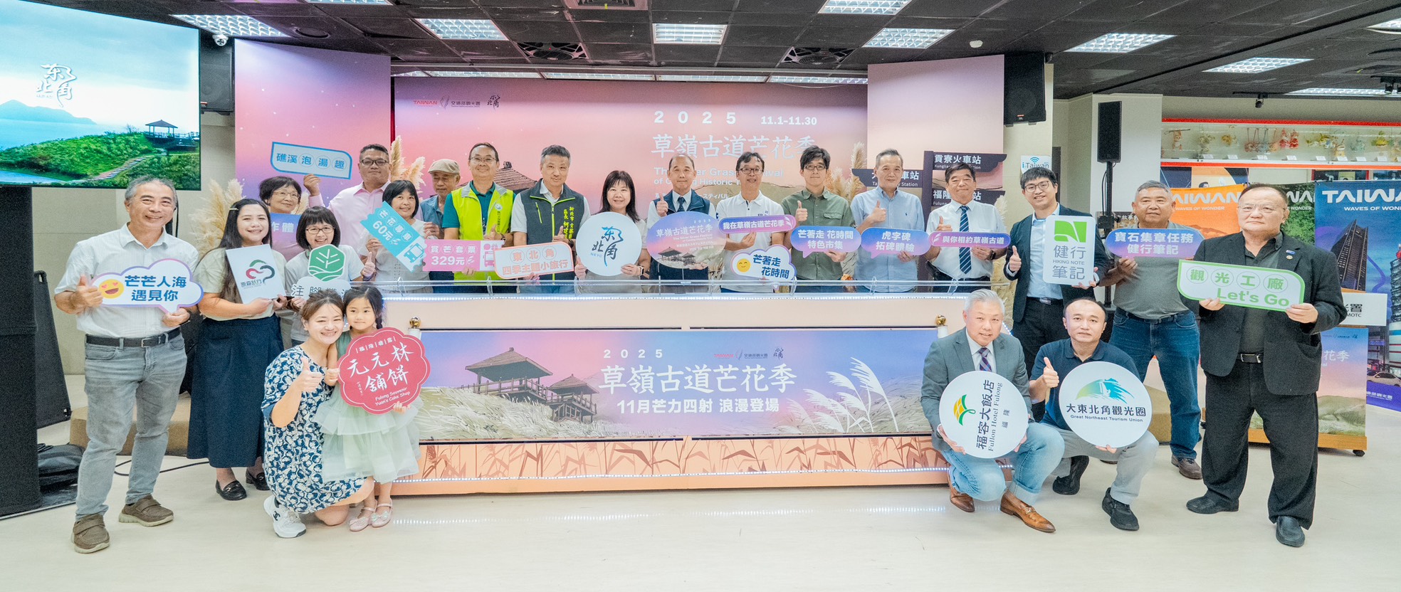 今日記者會由交通部觀光署主任秘書方正光、東北角及宜蘭海岸國家風景區管理處處長游麗玉、新北市觀光旅遊局局長楊宗珉、新北市貢寮區公所區長柯建輝、行政院農業部農村發展及水土保持署臺北分署秘書郭炳榮、大東北角觀光圈2位總顧問王文新及張清來、宜蘭縣觀光協會理事長卓志宏、宜蘭縣觀光工廠發展協會理事長陳家昇、新北市民宿協會理事長鄭淑麗、宜蘭縣溫泉產業發展協會理事長梁博凱、福容大飯店-福隆店總經理戴瑞宏及大東北角觀光圈業者等貴賓出席,攜手向國內外旅人誠摯邀約,一同走進秋日花浪,感受如詩如畫、只屬於東北角的季節之美。