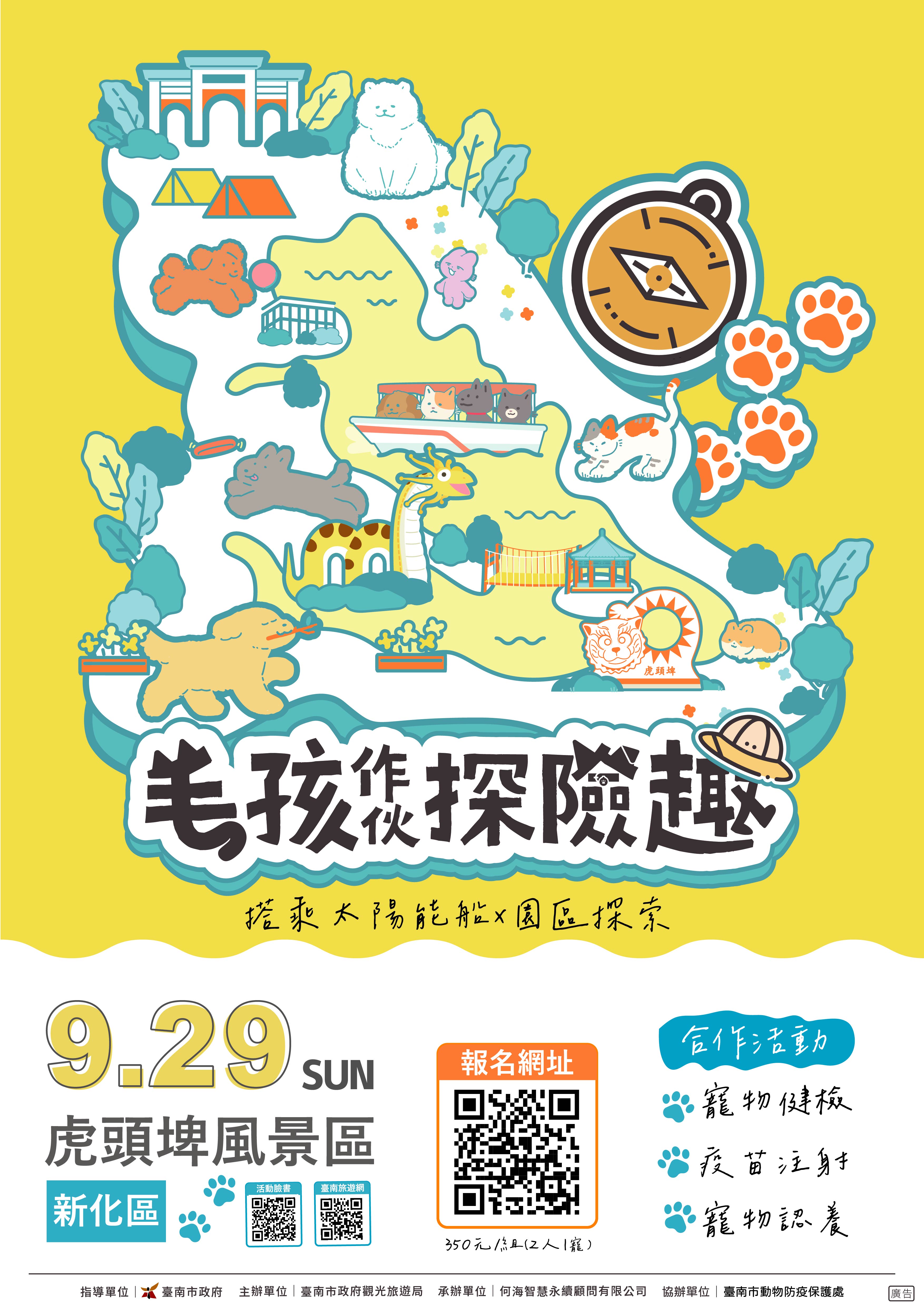 二、即日起開放2人1寵為組報名,報名網址(https://reurl.c c/KllbRq),歡迎報名參加,跟著毛孩搭太陽能船漫步百年勝景,作伙探險虎頭埤。