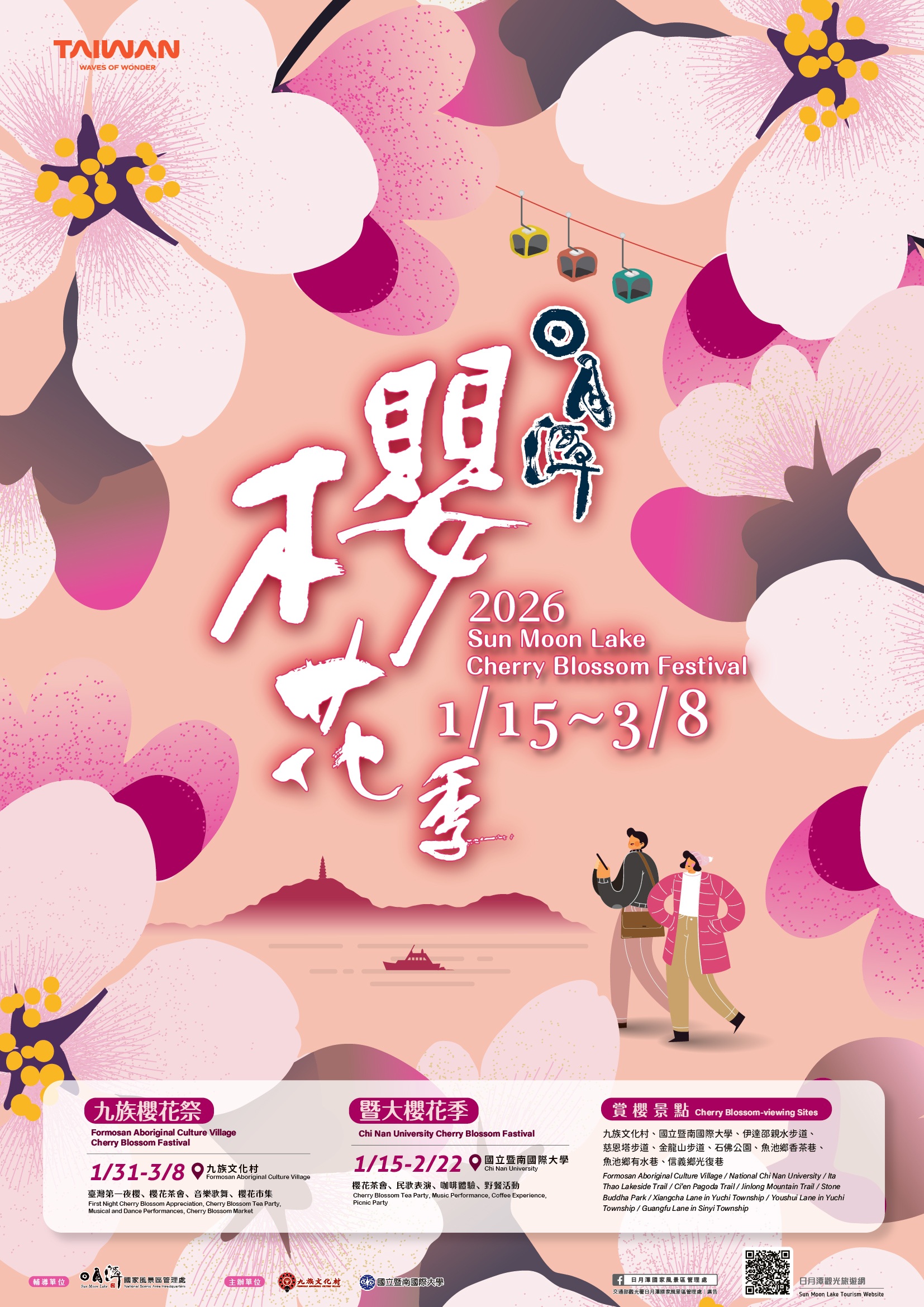 全台期待已久的年度盛事「2026日月潭櫻花季」正式揭開序幕!日月潭兩大賞櫻勝地「九族文化村」、「國立暨南國際大學」及協同在地產業,以超過五千株櫻花的粉紅花海為背景,搭配周邊限定遊程、店家優惠及搭好行抽好禮,邀請國內外遊客一同感受日月潭地區的浪漫春色。