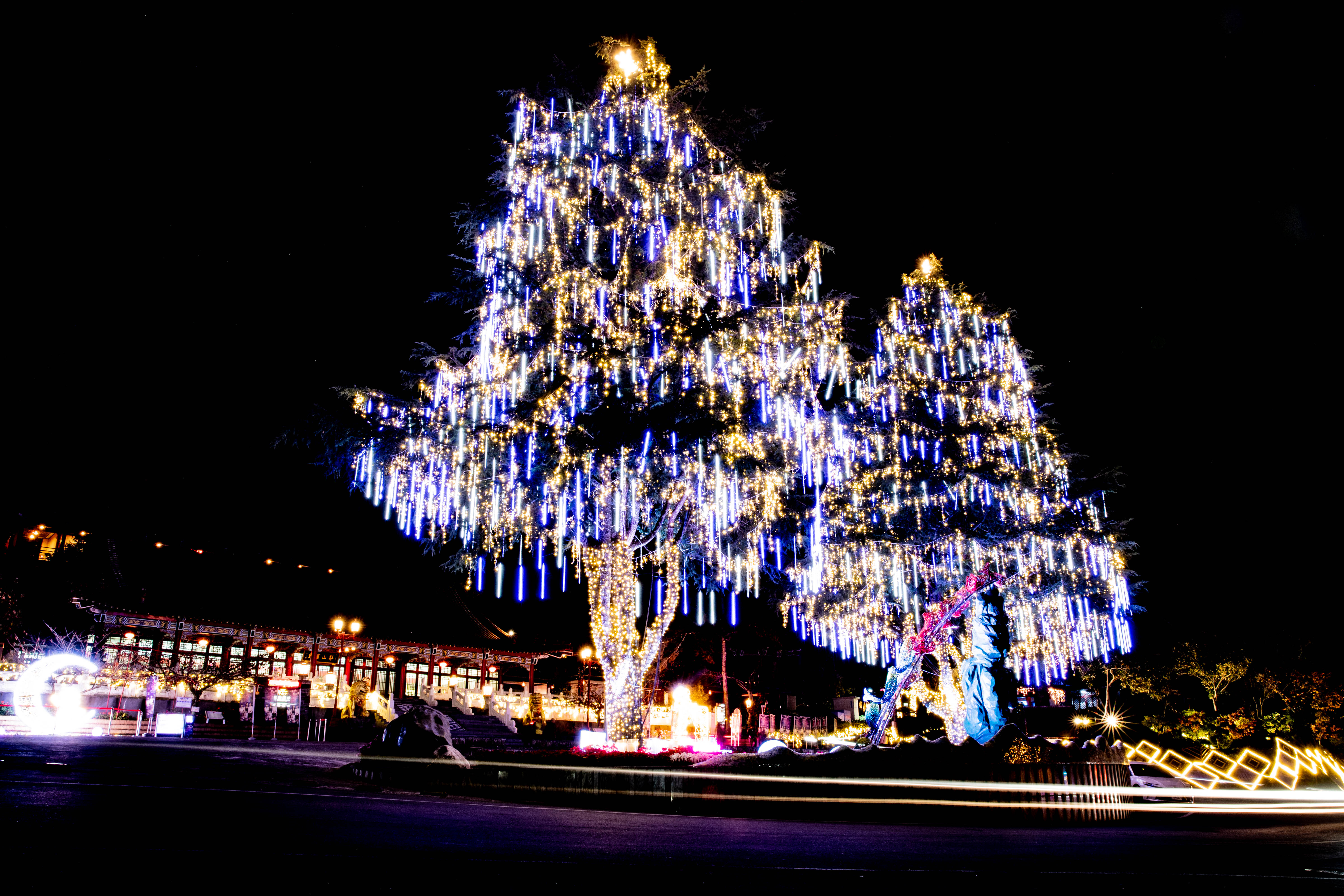 本處表示,本次梨山場域最大亮點,為兩棵高達 28 公尺的雪松 化身為「雲端上的耶誕樹」,透過冰柱燈與流星燈管交錯設計,模擬流星雨劃破夜空的動態光影,營造宛如銀河傾瀉、星辰躍動的視覺饗宴。燈光秀每 30 分鐘 演出一次,每場約 3 分鐘,讓旅客在靜謐高山中,定點欣賞限定星空聲光秀。廣場同時設置「喔熊的耶誕之約」燈飾,增添親子互動與節慶溫度,讓夜色更顯童話氛圍。