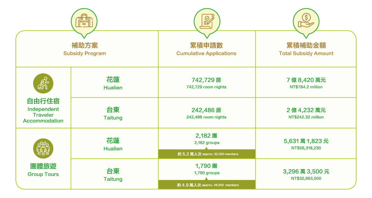 為重新點燃觀光動能,觀光署推動多項優惠方案,包含個別旅客住宿補助、團體旅遊優惠、交通方案等。其中,「個別旅客住宿優惠活動」補助花蓮74萬餘房、臺東24萬餘房,吸引逾200萬人次旅遊,創造超過100億元產值。同期,團體旅遊補助方案亦帶動約5.2萬人次前往花蓮、4.9萬人次遊覽臺東,進一步貢獻6.7億元的產值。