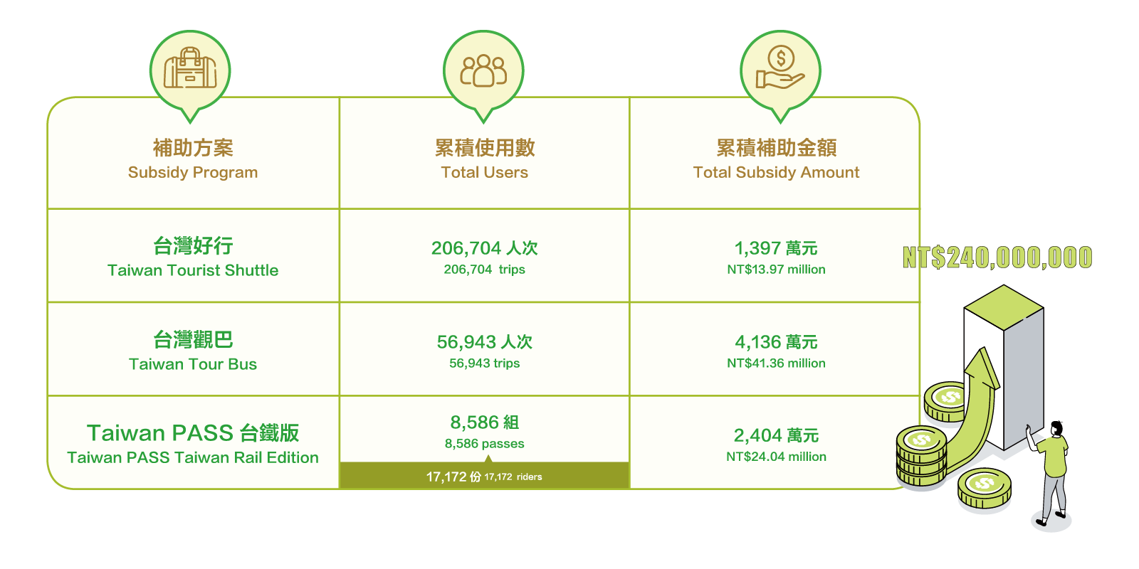 此外,透過交通優惠搭配觀光資源串聯,觀光署推出台灣好行電子票證免費搭乘、台灣觀巴花東套裝遊程2折優惠,以及Taiwan PASS台鐵版「2人同行1人免費」的限時方案,帶動超過4,800萬元觀光效益。